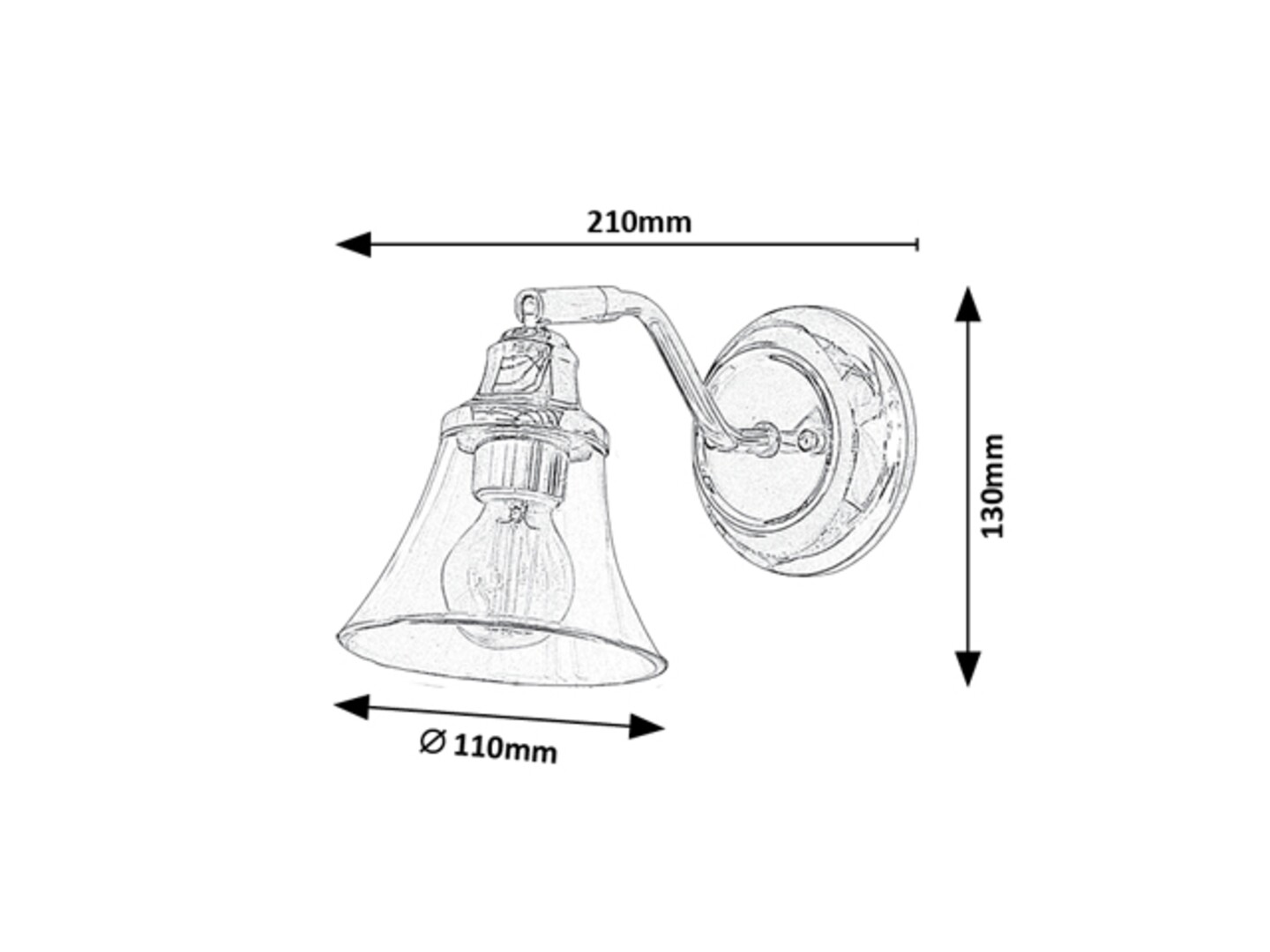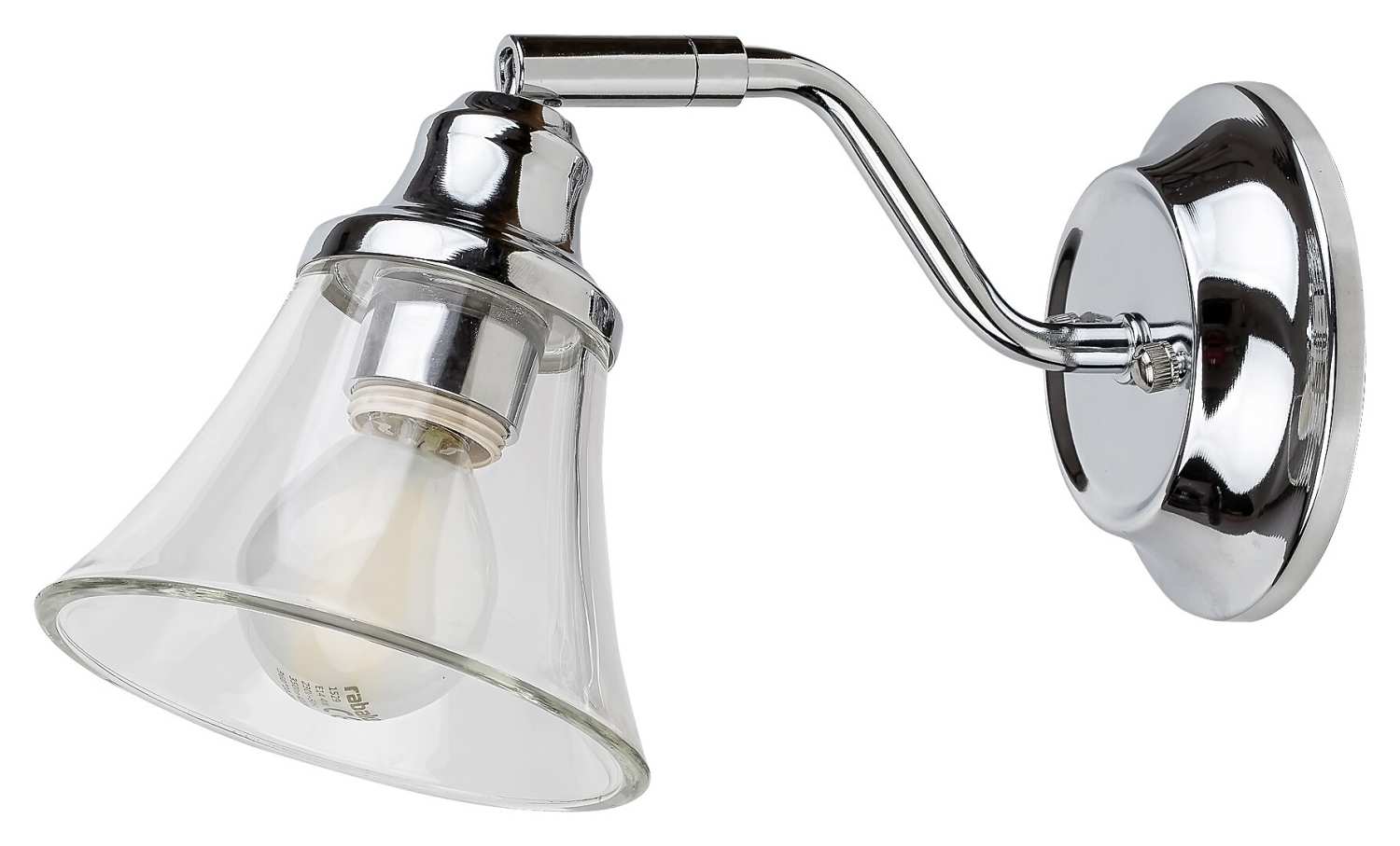 Цвят: хром кръгла метална основа с извито рамо и подвижен прозрачен стъклен разсейвател във формата на камбана.