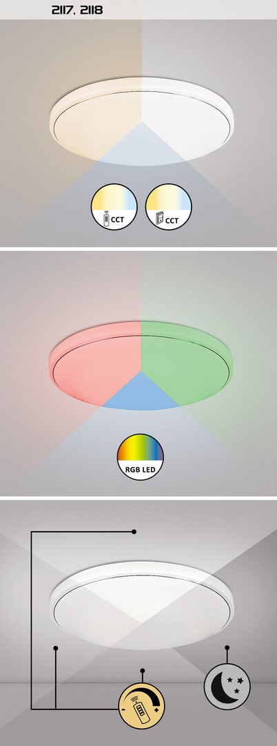 Особености: IP 20 ,с дистанционното можете да избирате силата и спектъра на светлината. Сред останалите интелигентни функции са регулиране на яркостта, памет, таймер, RGB осветление и нощно осветление – всички те могат да се управляват с дистанционно управление .