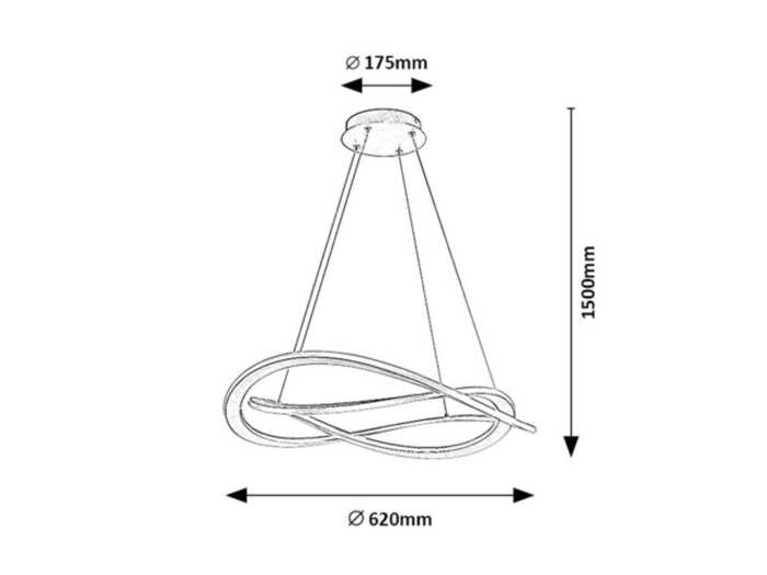 Производител Rabalux Материал Метал, силикон Цвят Златист Цокъл Вграден LED модул Температура на светлината 3000 K Еквивалент на класическата крушка 265 W Максимална мощност на източника 72 W Общ светлинен поток 3800 lm Функция LED технолигия Среден живот на ресурса 20000 h Дължина 1500mm/може да се коригира. Диаметър 620 mm Защита срещу проникване IP20 Напрежение 230 V Клас на защита срещу токов удар 1 Енергиен клас G