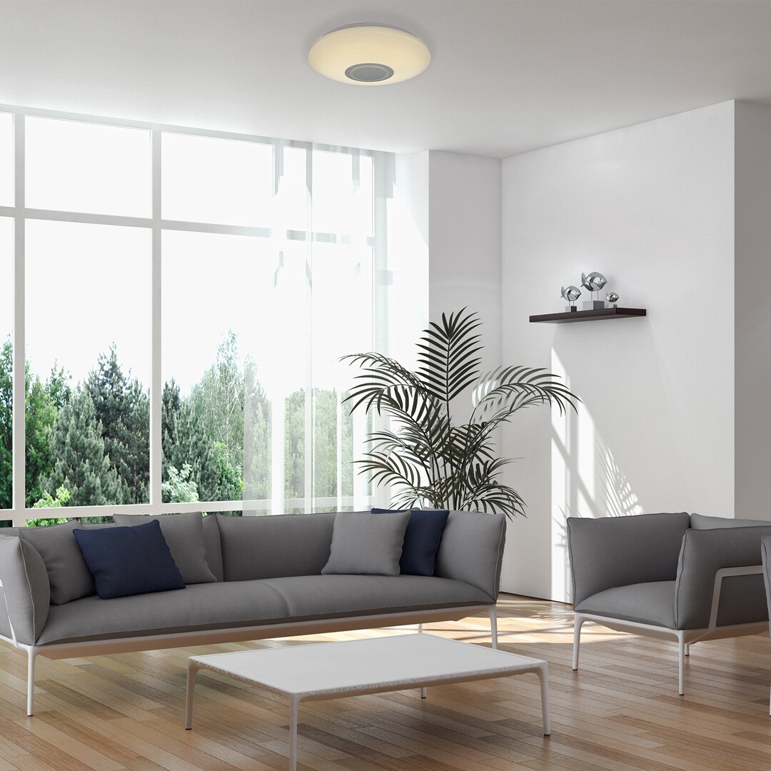 Особености:IP 20,с дистанционното можете да избирате силата и спектъра на светлината. Сред останалите интелигентни функции са регулиране на яркостта, памет, таймер, RGB осветление и нощно осветление – всички те могат да се управляват с дистанционно управление или чрез телефона.Плафониерата има вграден високоговорител чрез който може да слушате музика.
