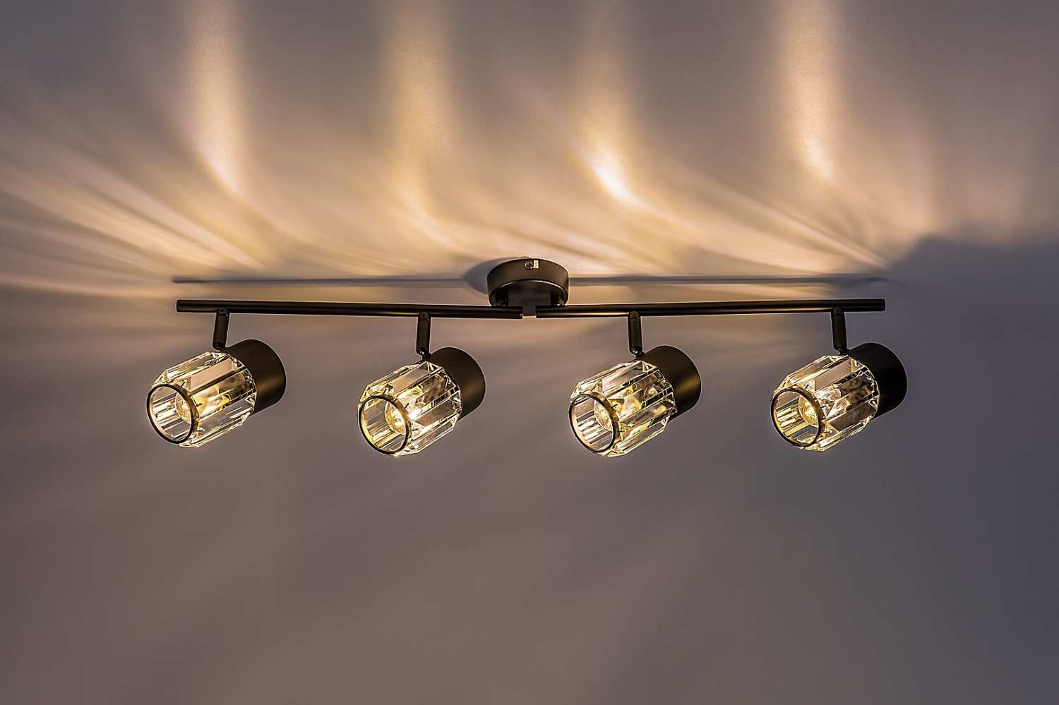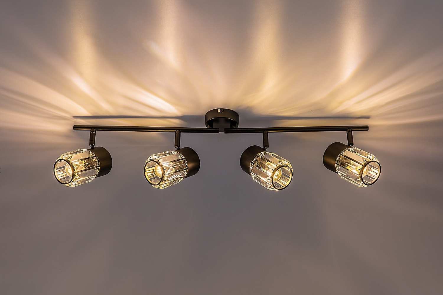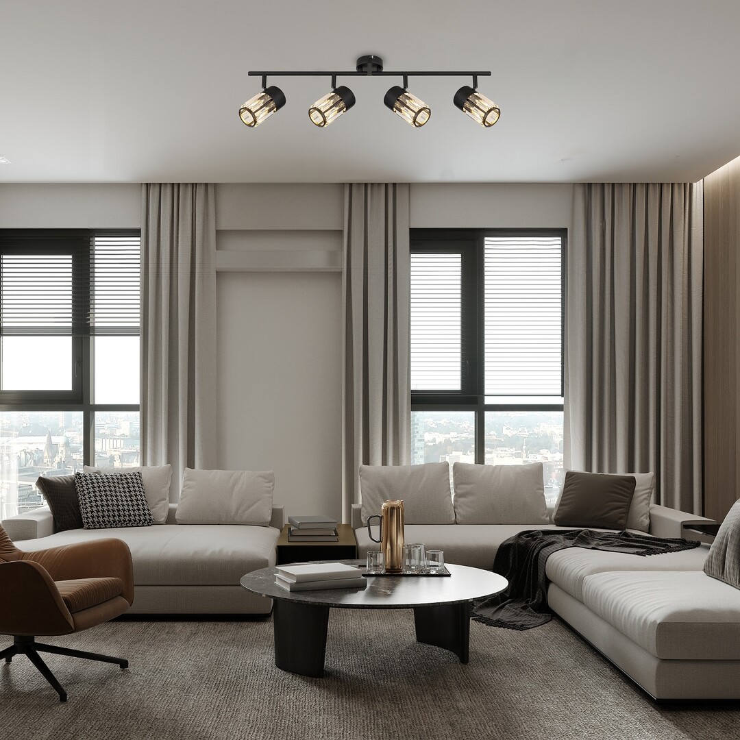Таванната лампа Rabalux Venaro с 4 крушки е препоръчителна за тези, които търсят осветително тяло в класически стил, което е подходящо за по-просторни помещения в дома им. Таванната лампа е изработена от метал в черен цвят и може да бъде фиксирана към тавана с помощта на малка кръгла декоративна основа. Лампите са разположени в редица, една до друга, върху носеща лента, прикрепена към декоративната основа. Абажурите, изработени от стъкло, имат цилиндрична форма и характерна кристално подобна повърхност.Лампите могат да се въртят благодарение на топчестото съединение, така че светлината да бъде насочена според вашите нужди. Този модел е идеален избор не само за всекидневната и спалнята, но и за кухнята и трапезарията.