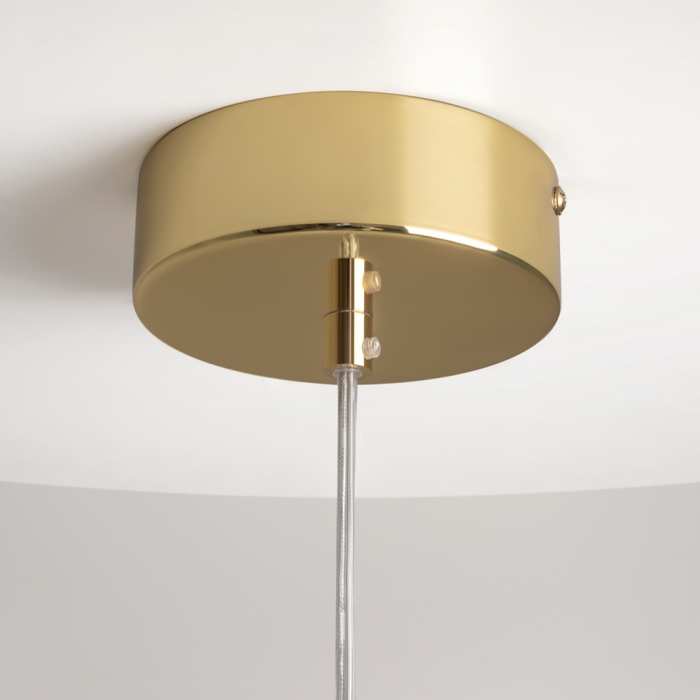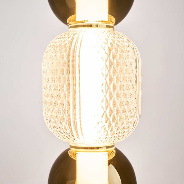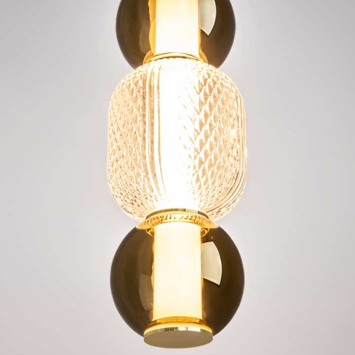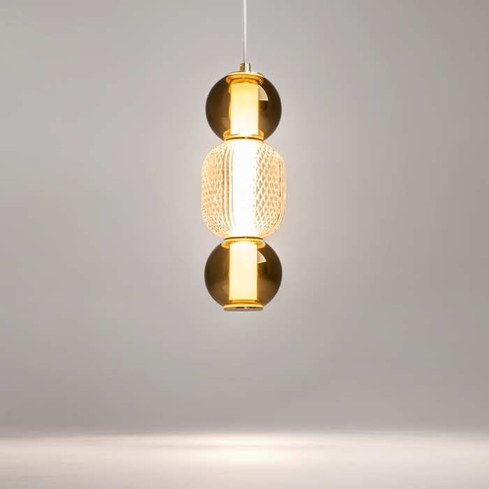 Стилен LED висящ полилей от серията Drop,, изработен от златиста метална основа и тяло със сферични стъклени абажури в цвят коняк и заоблена релефна сфера с диамантено оформен мотив от прозрачно стъкло с вграден 16W 3000K LED. . Атрактивна лампа, която ще придаде модерен стил и комфортна светлина на вашия хол, трапезария, спалня. Ярката светлина, идваща от капкообразните абажури, създава водопад от многоцветни отблясъци. Височината на висящите лампи е регулируема. Максималната дължина на кабела е 3 метра, което позволява използването на лампите в помещения с високи тавани.