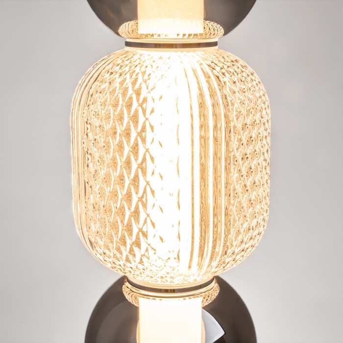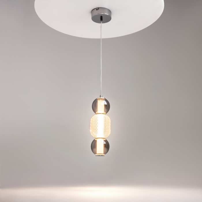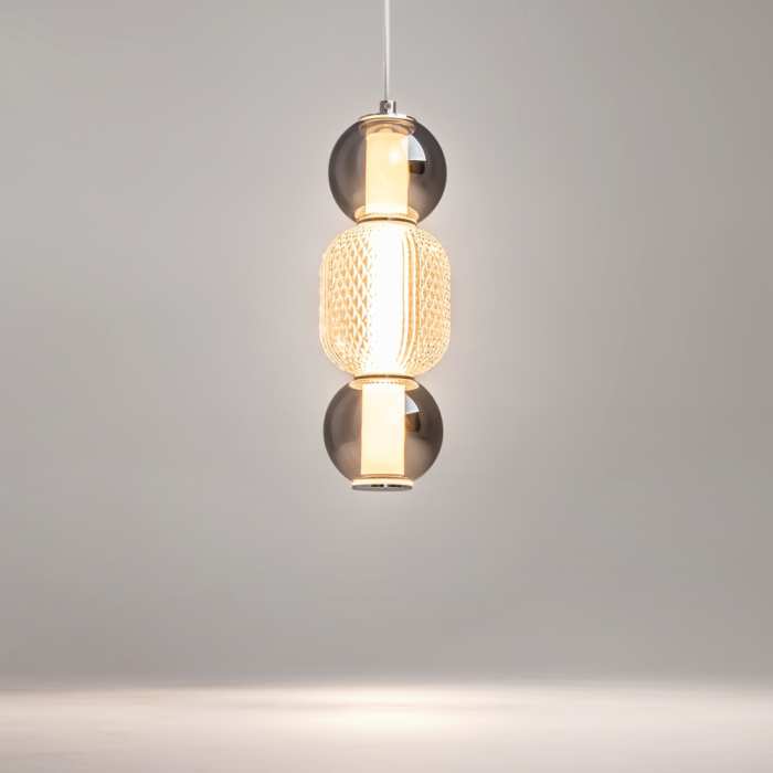 Стилен LED висящ полилей от серията Drop, изработен от хромирана метална основа и тяло от опушени сферични стъклени абажури и заоблена релефна сфера с диамантено оформен мотив от прозрачно стъкло с вграден 16W 3000K LED. Атрактивна лампа, която ще придаде модерен стил и комфортна светлина на вашия хол, трапезария, спалня.Ярката светлина, идваща от капкообразните абажури, създава водопад от многоцветни отблясъци.Височината на висящите лампи е регулируема. Максималната дължина на кабела е 3 метра, което позволява използването на лампите в помещения с високи тавани.